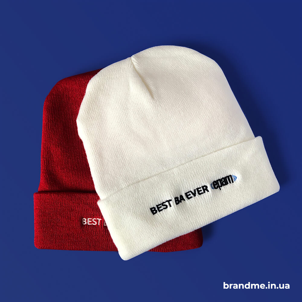 - Машинна вишивка. Забезпечує високу міцність і зносостійкість отриманого зображення. Вишивка логотипа на шапках виглядає дуже стильно та ефектно. Ця технологія нанесення підходить для брендування виробів з гладкою фактурою та великою в’язкою. Зображення може бути пласким або об’ємним.